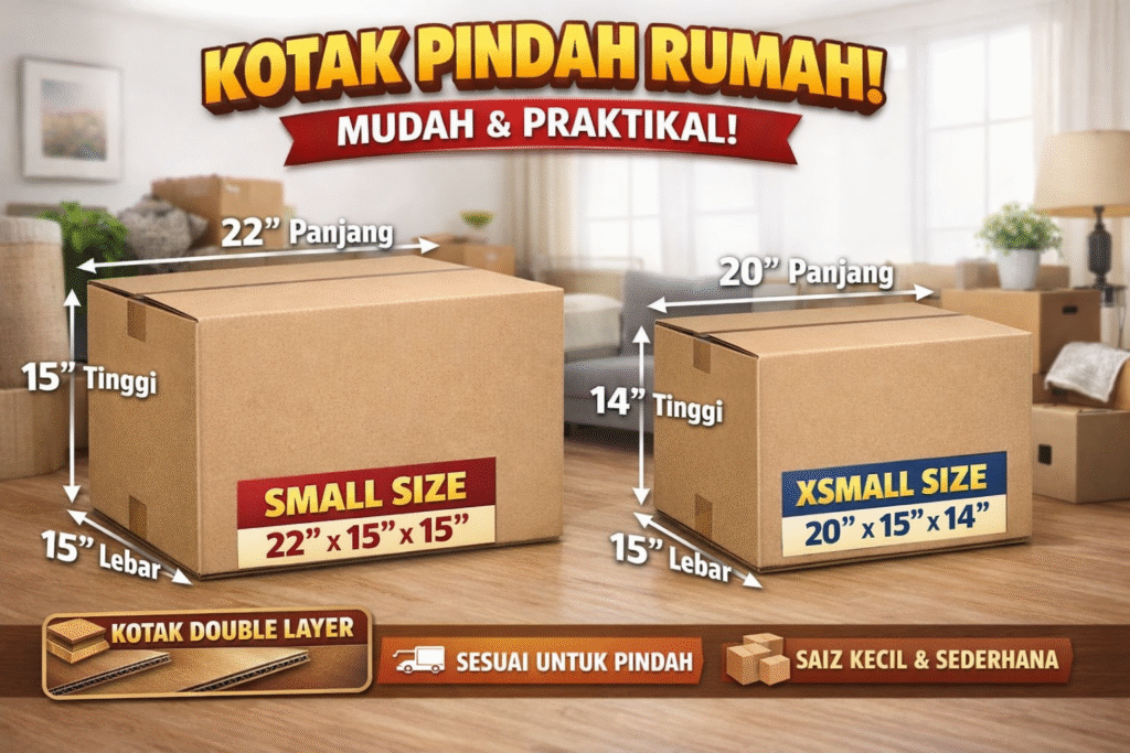 Kami menyediakan kotak carton pindah rumah double layer yang berkualiti tinggi, sesuai untuk kegunaan pindah rumah, pejabat dan simpan barang.